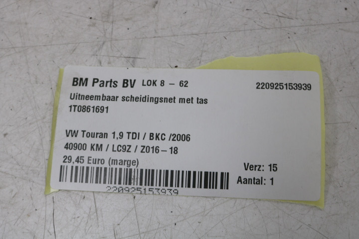 Terug / interieur / Bagage Onderdelen / Scheidingsnet / Uitneembaar scheidingsnet met tas VW Touran 1T