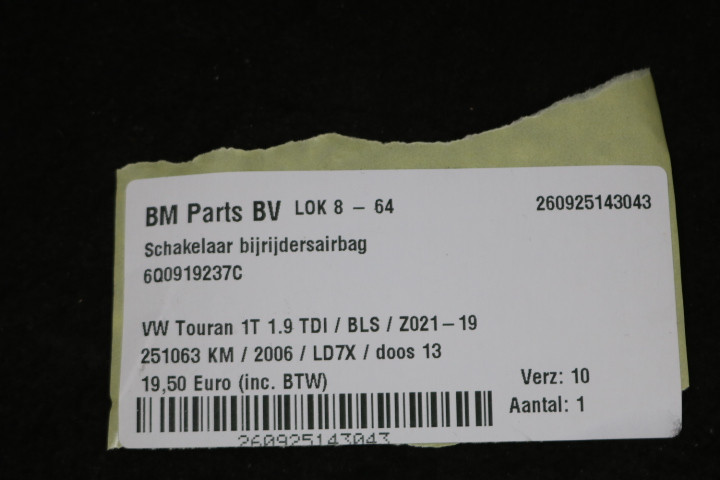 Schakelaar bijrijdersairbag VW Touran 1T
