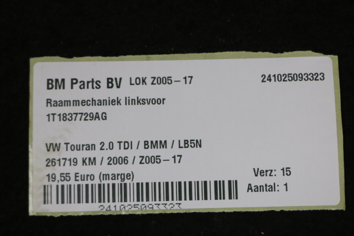 back / Exterieur / Wissers & Ruiten / Mechaniek Voordeur / Raammechaniek linksvoor VW Touran 1T