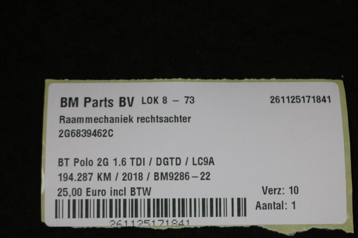 Raammechaniek rechtsachter VW Polo 2G