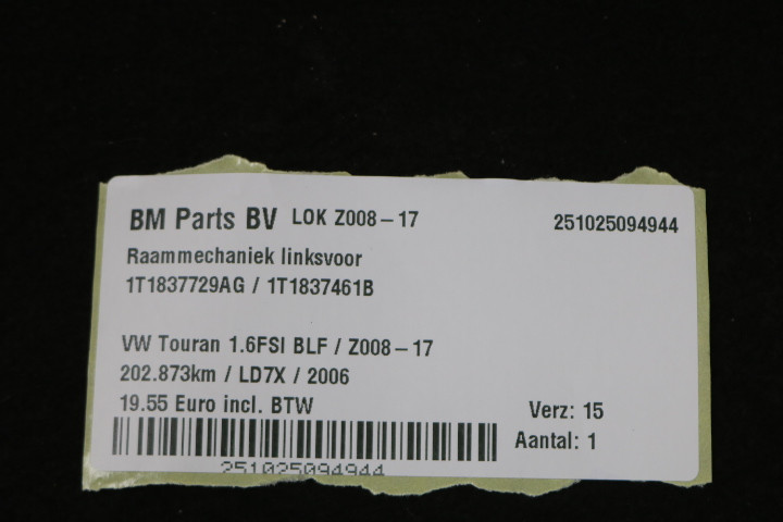 Raammechaniek linksvoor VW Touran 1T