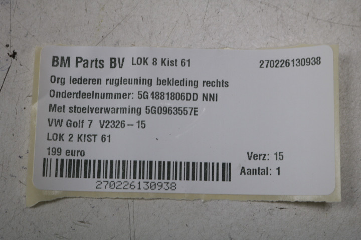 Origineel lederen rugleuning bekleding rechts VW Golf 7 NNI
