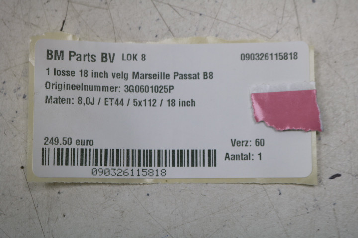 ORIGINEEL! 1 losse 18 inch Marseille velg VW Passat 3G! 3G0601025P